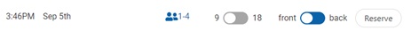 After selecting a date, you will have times available. Each time has options to select from: 1-4 means that up to four slots are open, while 9 or 18 means that you may choose to play either 9 or 18 holes. Same with front or back: you are choosing to start either on Hole #1 or Hole #10. Press the Reserve button to move on in the reservation system.
